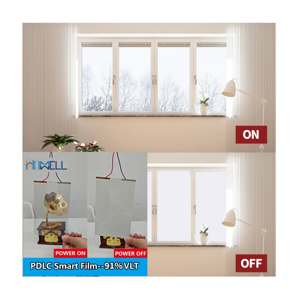 It combines the advantages of safety glass—excellent impact resistance, EVA film, and a laminated smart film—that adheres securely to the glass, preventing debris from injuring people in the event of impact breakage. It blocks over 99% of UV rays and over 98% of infrared rays, with insulation performance reaching Level 2 or higher. In the "Off" state, when the smart film is not powered, light is absorbed or scattered, and the film appears dark gray or white. In the "On" state, light is transmitted, and the film appears transparent. We can also provide an installation video!